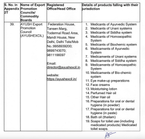 - DGFT has added the AYUSH Export Promotion Council to the list of Export Promotion Councils. You can see in the image the list of export items that will now fall under the AYUSH Council.