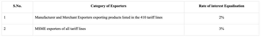 The second category consists of all MSME Manufacturer Exporters. They receive a 3% rate of interest equalization, and there are no restrictions on the products exported. This means that MSME exporters dealing in any product will get a 3% discount on their normal ROI.