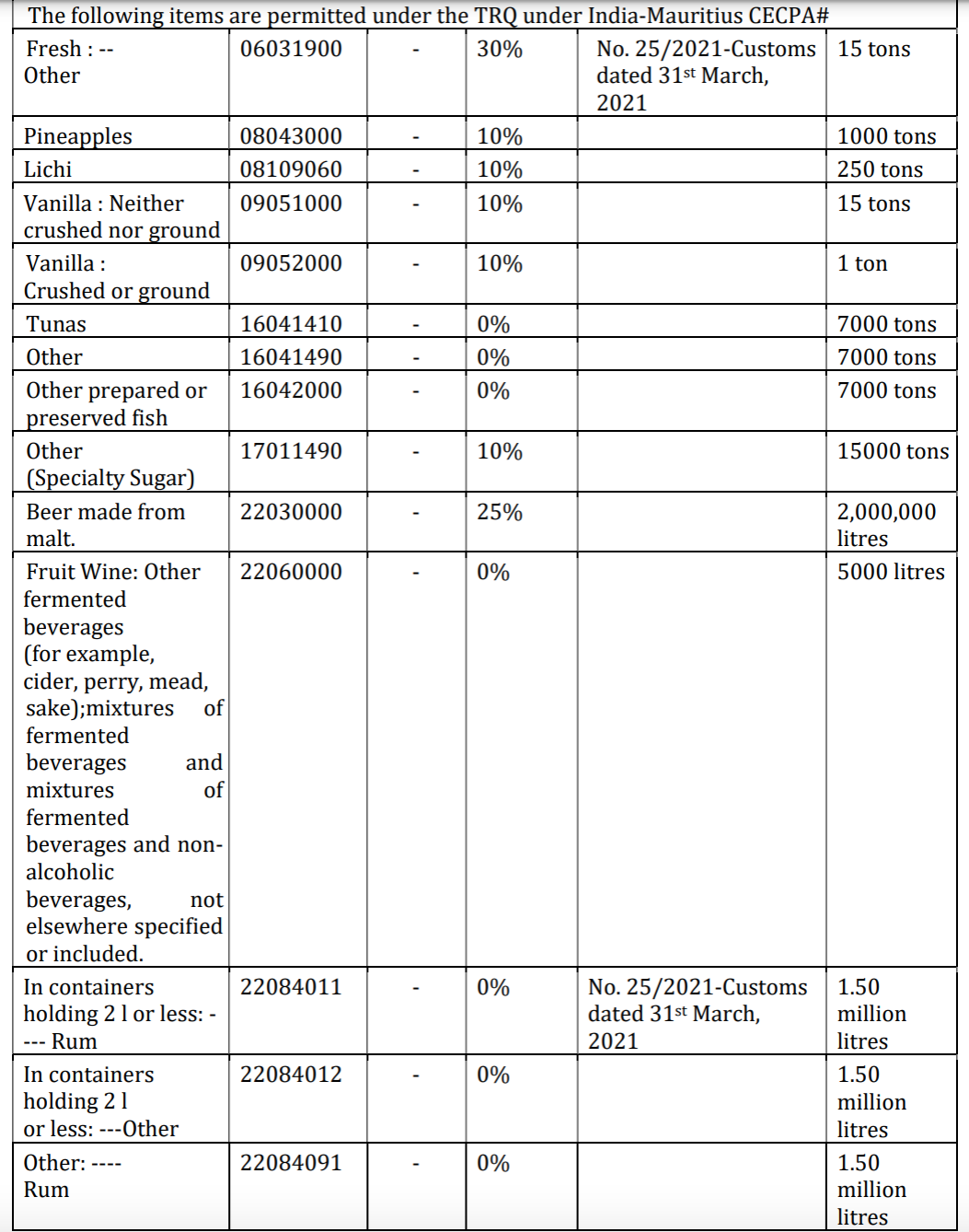 As you can see in the image, all these items are allowed for import under the Tariff Rate Quota Scheme (TRQ) under the India-Mauritius CECPA.
