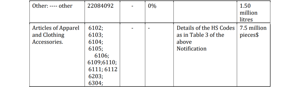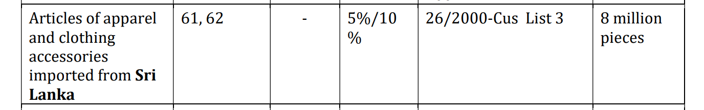 For Example – Apparel and clothing accessories can be imported from Sri Lanka with a duty of 5% up to 8 million pieces. After crossing 8 million pieces for a particular financial year, imports will attract a regular 10% duty.